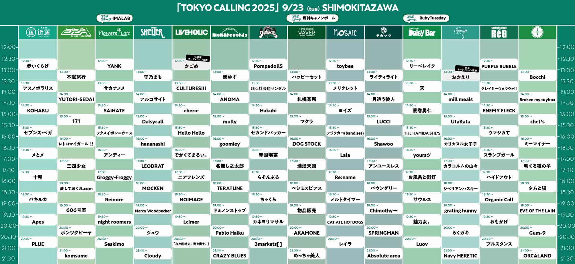 下北沢シャングリラ / 下北沢SHELTER / 下北沢 RéG / 下北沢ERA / LIVE HOUSE WAVER / mona records / 近松 / 近道 / Retronym / MOSAiC / DaisyBar / Flowers Loft / LIVEHOLIC / 251 |